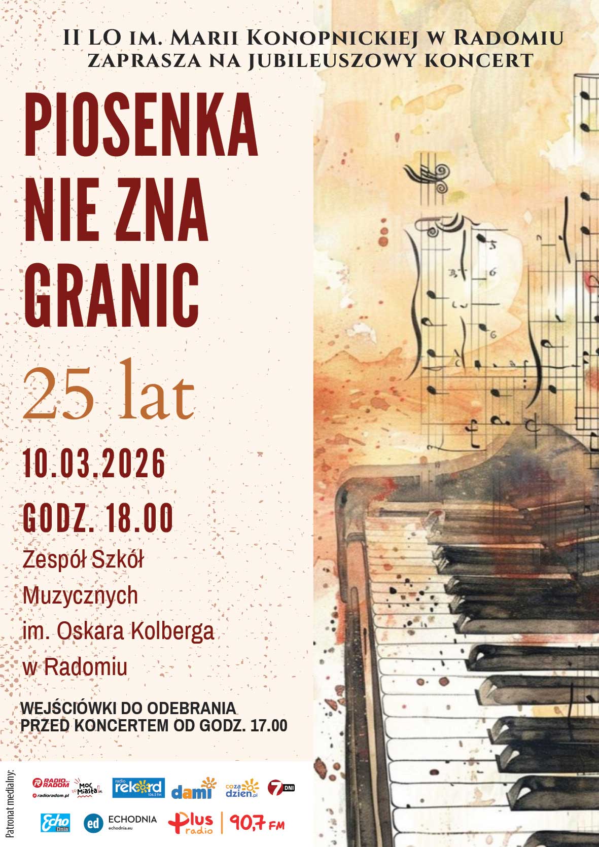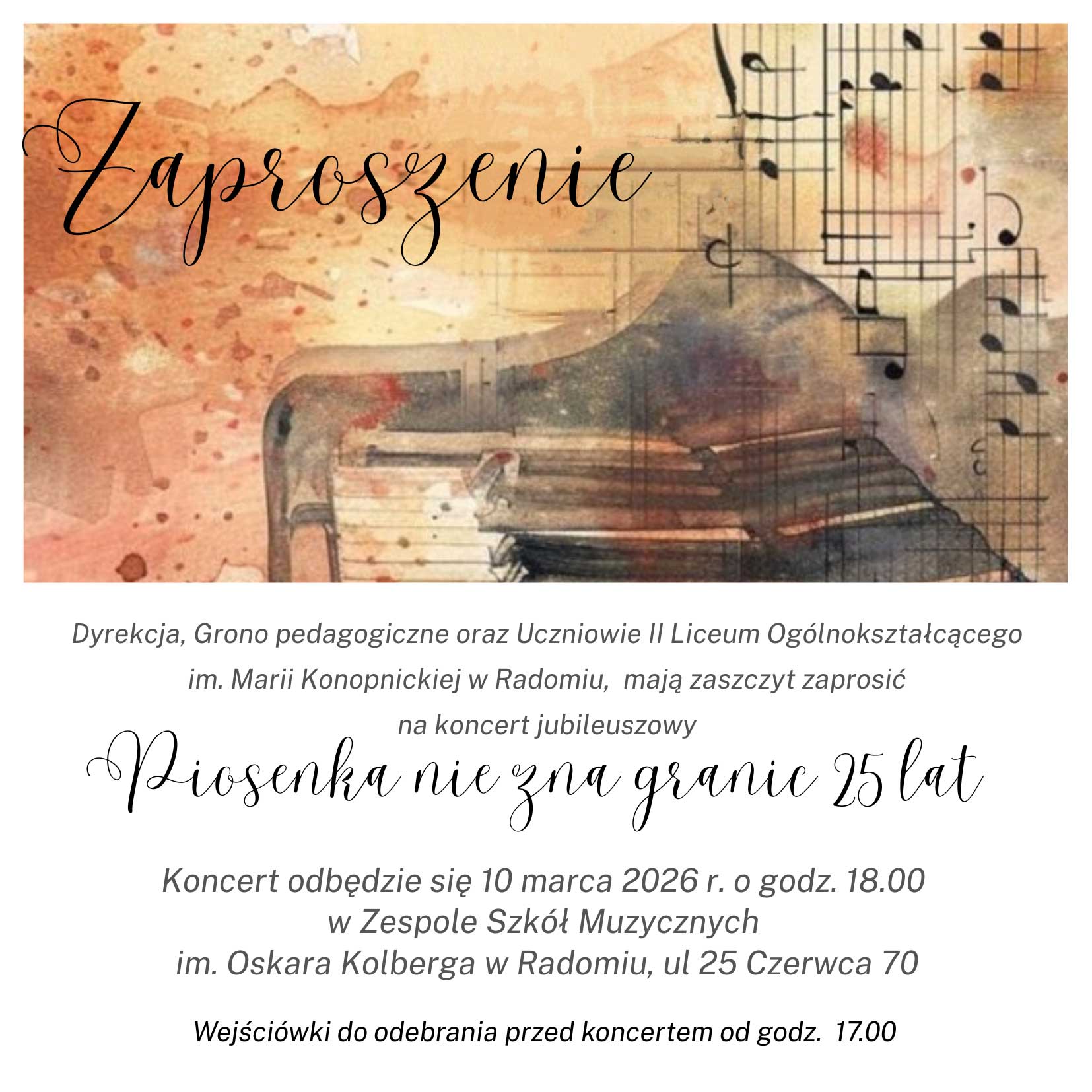 II Liceum Ogólnokształcące im. Marii Konopnickiej w Radomiu zaprasza na jubileuszowy koncert z cyklu „Piosenka nie zna granic”, który odbędzie się 10 marca 2026 r. o godz. 18.00 w Zespole Szkół Muzycznych im. Oskara Kolberga w Radomiu.